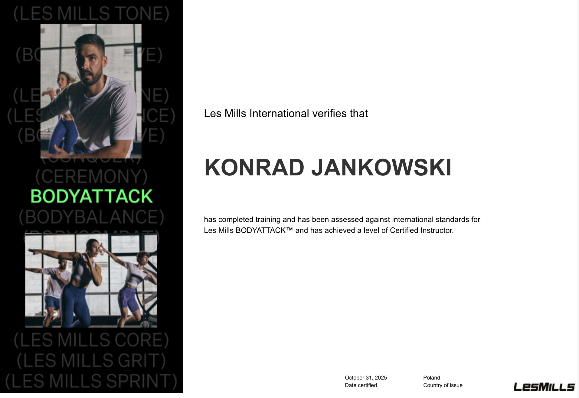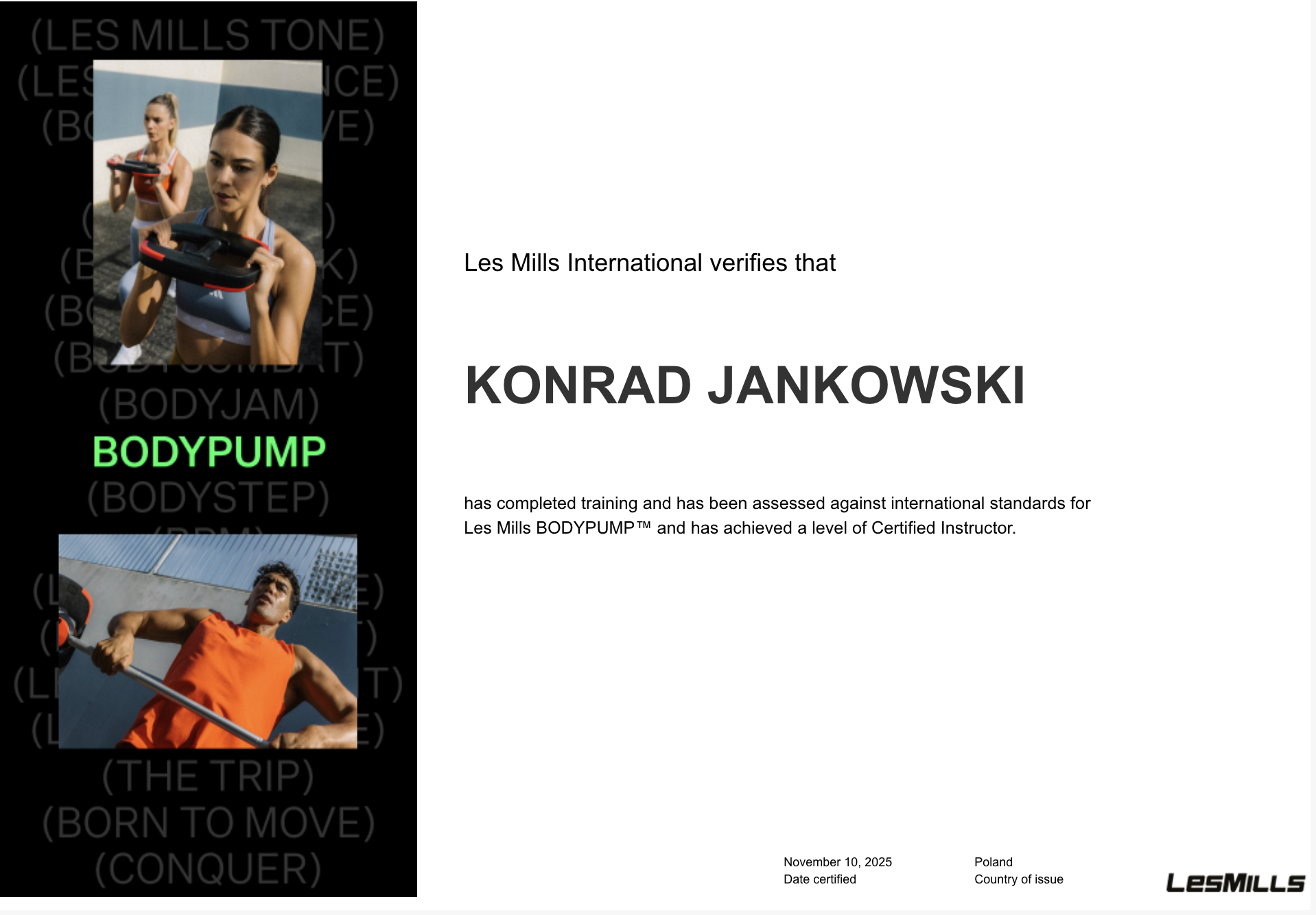 Podczas studiów zacząłem swoją drogę jako instruktor fitness – i od razu trafiłem na najwyższy poziom: programy Les Mills (BodyCombat, GRIT, CXWORX). To tam zrozumiałem,